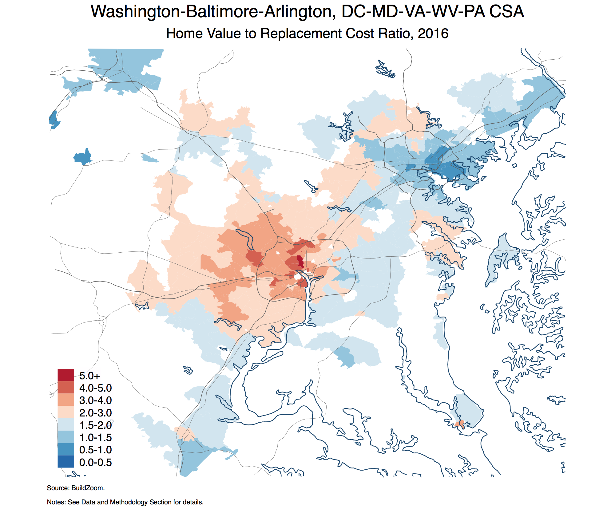 High home value to replacement cost ratios are a good indication that the housing supply is restricted, meaning that people who are willing and able to pay enough to support new housing construction are being excluded by limits on density.